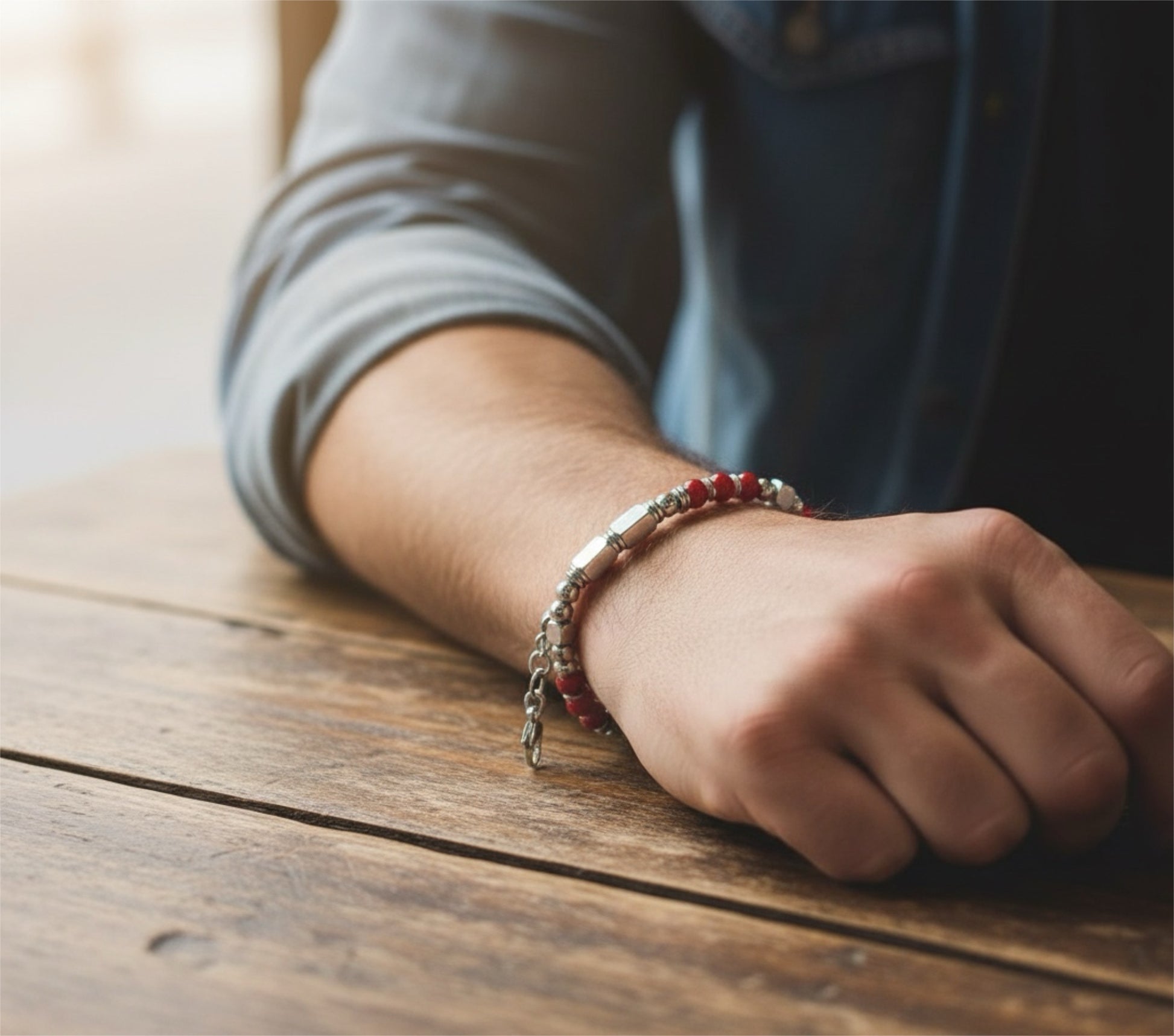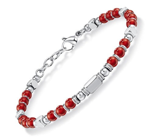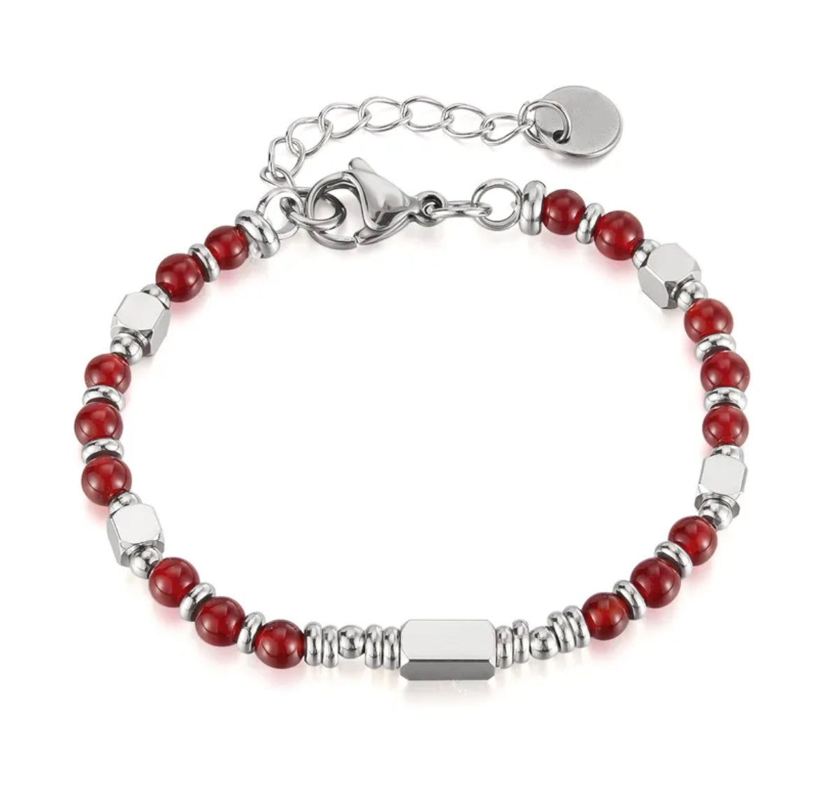 Alliant pierres naturelles Agathe Rouge et acier inoxydable, ce bracelet au motif géométrique incarne l’élégance vintage, Léger (12g), résistant et raffiné, il se porte en toute saison pour un style soit féminin que mascoline intemporel. Fermoir mousqueton sécurisé